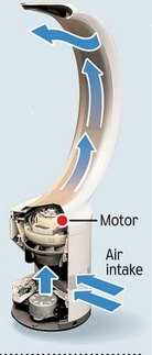 날개없는 선풍기는 사실 소비자들의 눈에 보이는 날개만 없을뿐, 실제로는 선풍기의 스탠드 부분에 날개가 있어서 그 날개가 바람을 일으키며 원통형을 따라 돌면, 주변에 있던 공기들도 함께 빨려들어가는 원리를 이용한 것. 그래서 날개가 보이지만 않을뿐입니다.
