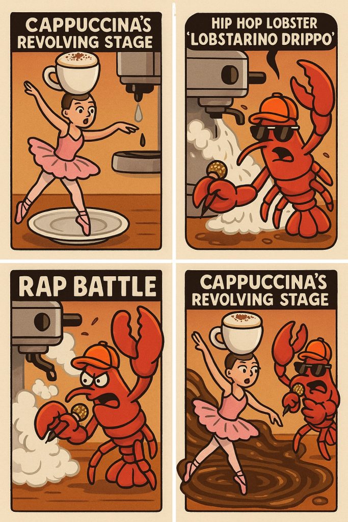 발레리나 카푸치나(Ballerina Cappuccina): 카푸치노 컵을 머리로 한 발레리나 캐릭터로, 우아함과 기괴함이 결합된 모습입니다.