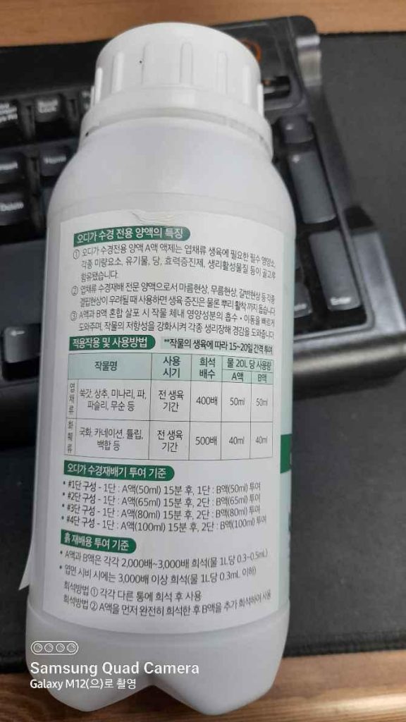 - 주의: 농도가 매우 높으므로 한꺼번에 많이 넣으면 pH가 급격히 떨어져 뿌리에 쇼크가 올 수 있습니다